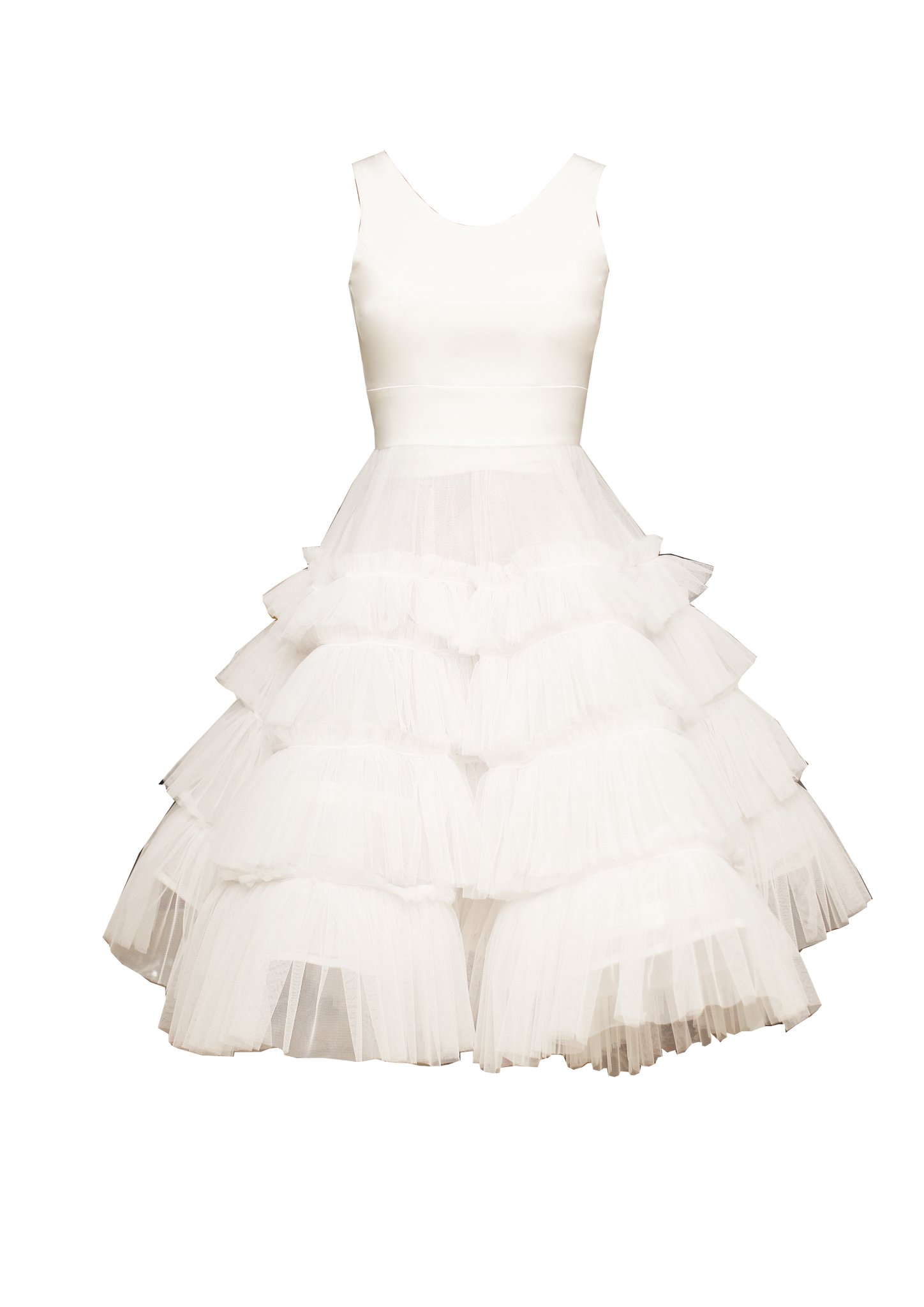 The price displayed is for the 'LAILA PETTICOAT DRESS' only. All other styles can be added at additional costs and are not included in the price displayed. Please shop at additional costs 'MALIKA RUFFLE TULLE CAPE' and the 'AMINA MOHAIR DRESS' as shown.
